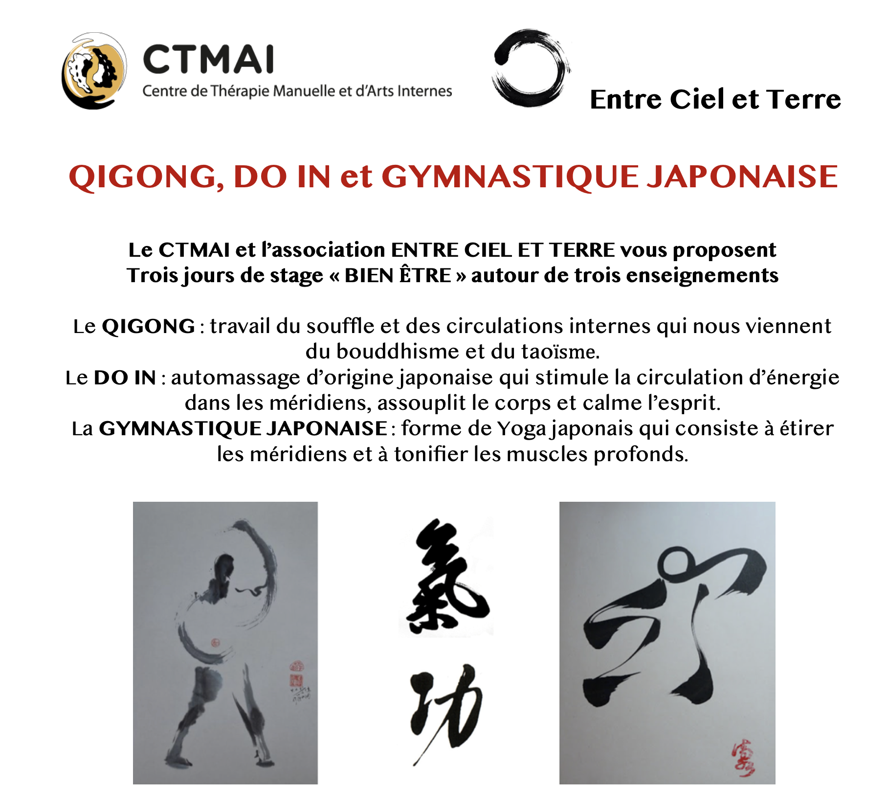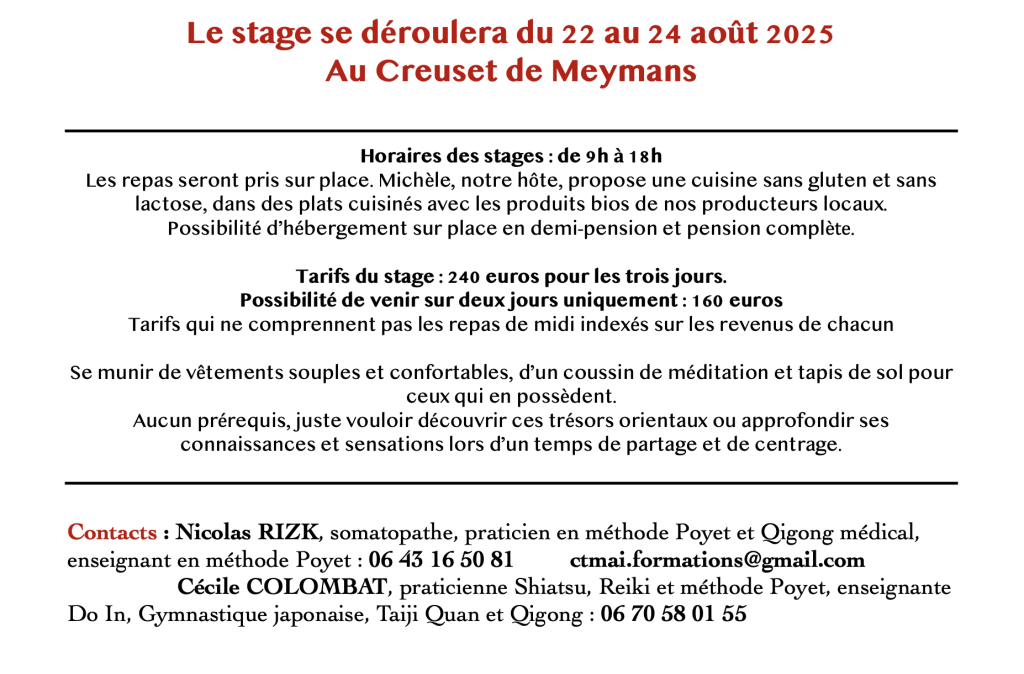 Les 22, 23 et 24 août, le CTMAI organise un stage autour de trois pratiques énergétiques orientales.